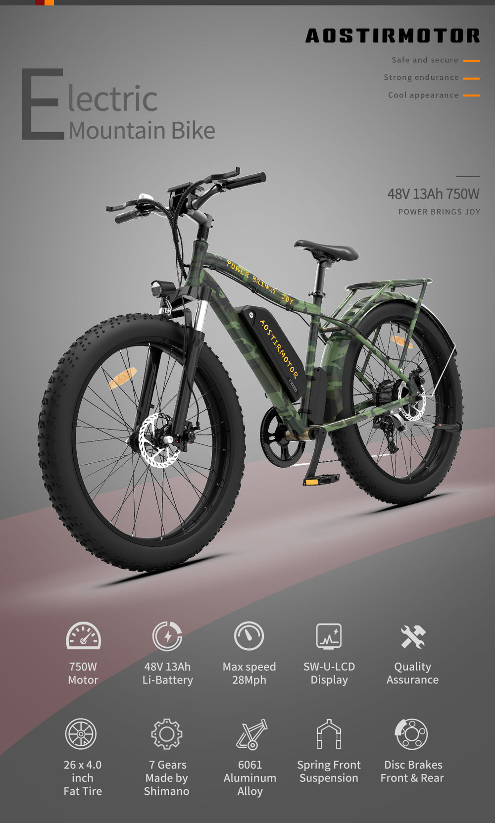 AOSTIRMOTOR Electric Mountain Bike S07-D free shipping today on all Aostirmotor orders at e-Wheels Warehouse, this electric mountain bike is perfect for people who want to get outside and ride. The S07-B Electric Mountain Bike Camouflage is the perfect way to enjoy the outdoors while getting a workout in. With a powerful motor that helps you climb hills and tackle tough terrain, this bike will make your next outdoor ride an adventure.