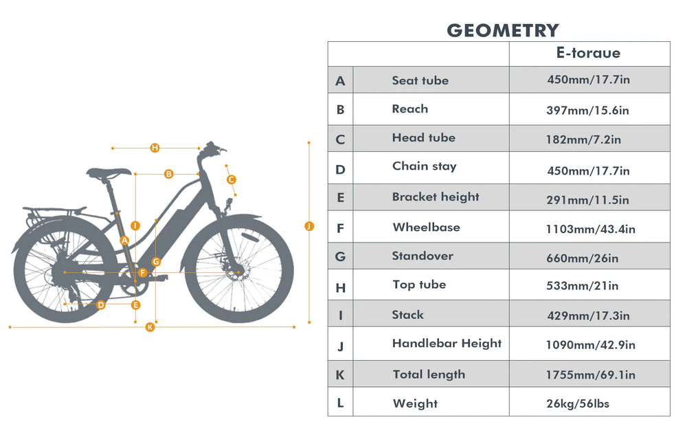 The E-TORQUE model is an economically-priced urban bike that offers a distinctive blend of top-notch components. Its electric system is equipped with impressive amenities and complements the bike's sleek design and comfortable fit. The bike boasts a comprehensive array of features, including pedal assist, throttle, full-color display, and LED lights.