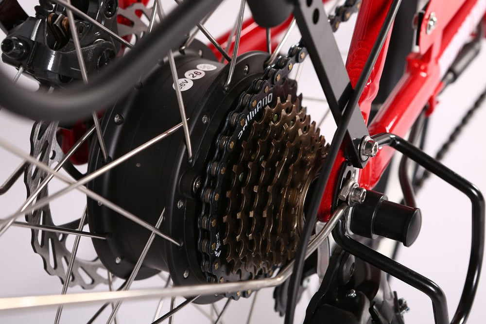 This 100% hand welded lightweight aluminum frame bicycle has our 7 Speed Shimano Tourney® Gears & Shifting System, a battery pack consisting of 7 lightweight lithium cells running at 36 volts 10 amps, and oversize 26" x 2.125 Kenda® Balloon Cruiser Street Tires, aluminum rims with quick release axle on the front and a waterproof quick disconnect on the rear. Black, Metallic Blue, Metallic Red, and White colors are available