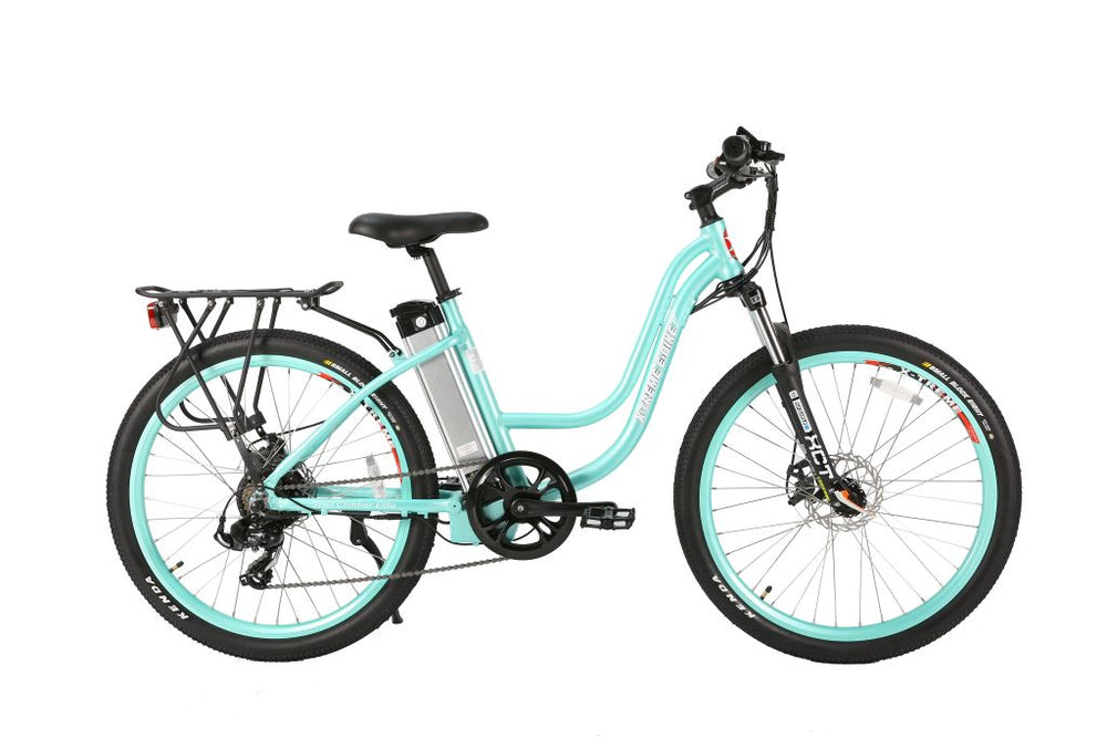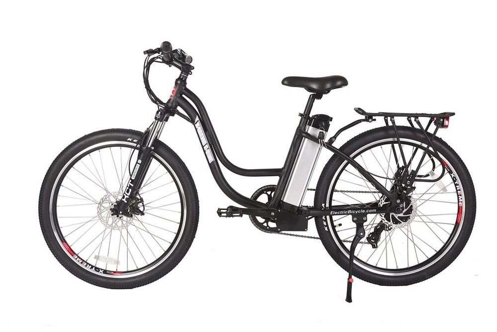 The Trail Climber Elite 24V is a Lithium Battery powered Electric Bicycle with a step-through frame, running on a 300 Watt Zero Resistance rear hub motor. Made with all top-of-the-line components this model includes a 7 Speed Shimano Tourney® Gears & Shifter System, 7 Lightweight Lithium 24 Volt 10.4 Amp (previously only 8 amps) LiPo4 Batteries, a 100% Aluminum Alloy Frame, fully Adjustable Seat, and a Suntour hydraulic front fork.
