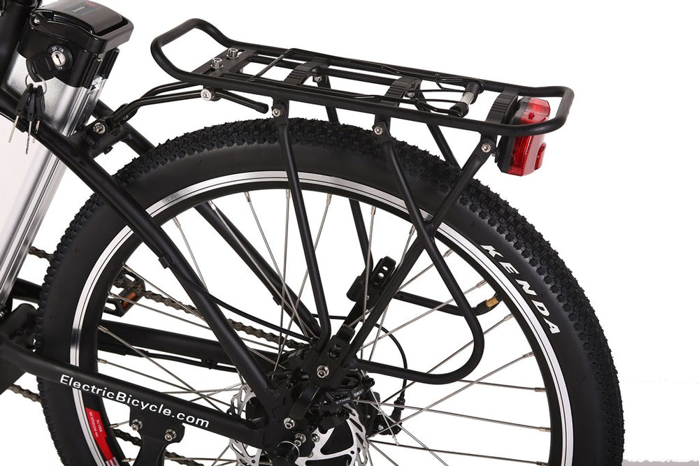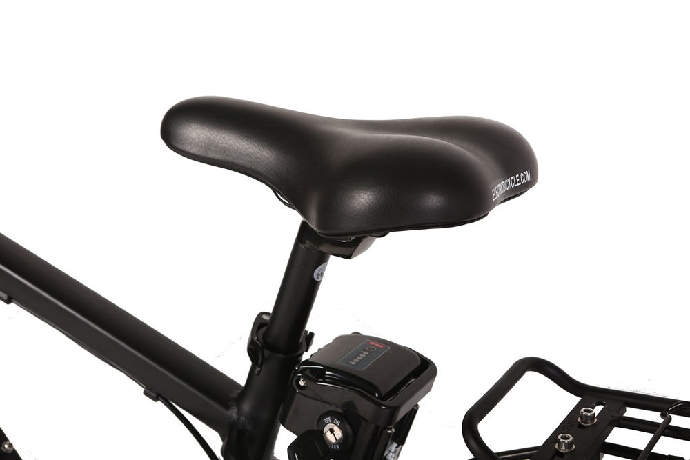 The Trail Maker Elite is a Lithium Battery powered Electric Bicycle, running on a 300 Watt Zero Resistance rear hub motor. Made with all top-of-the-line components this model includes a 7 Speed Shimano Tourney® Gears & Shifter System, 7 Lightweight Lithium LiPo4 Batteries, a 100% Aluminum Alloy Frame, a fully Adjustable Seat, and a Suntour hydraulic front fork.