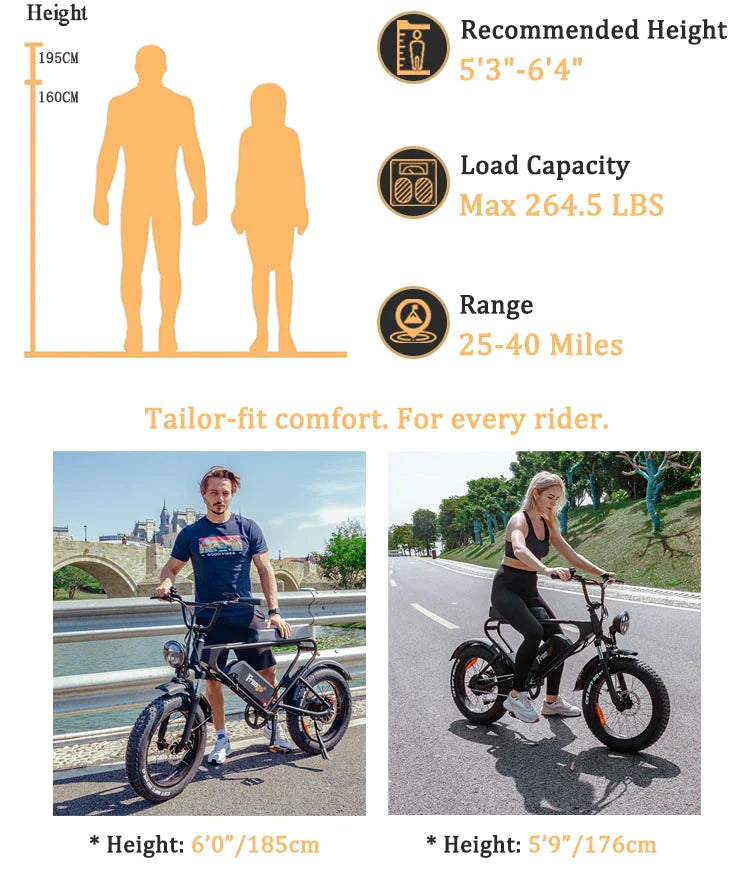 The Freego DK200 electric bike is equipped with a powerful 1200W motor. It also features a traditional snow triangle mount and a powerful Front Suspension that absorbs any bumps on the trail. 20" fat tires make for a more stable ride for all road conditions.